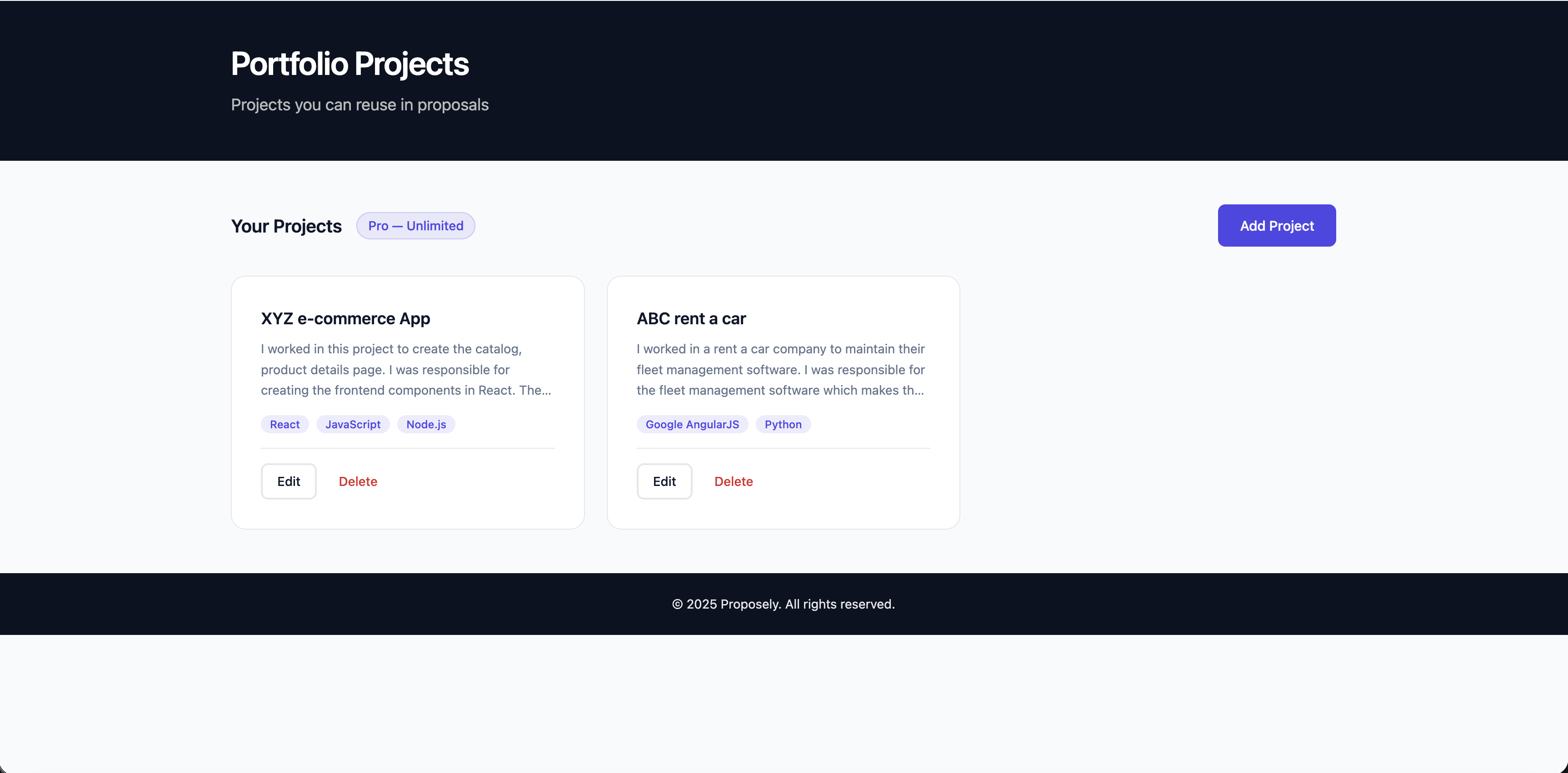 Add your best work once. The system remembers everything. Tools like Proposely implement this through portfolio management features that store projects with skill tags.