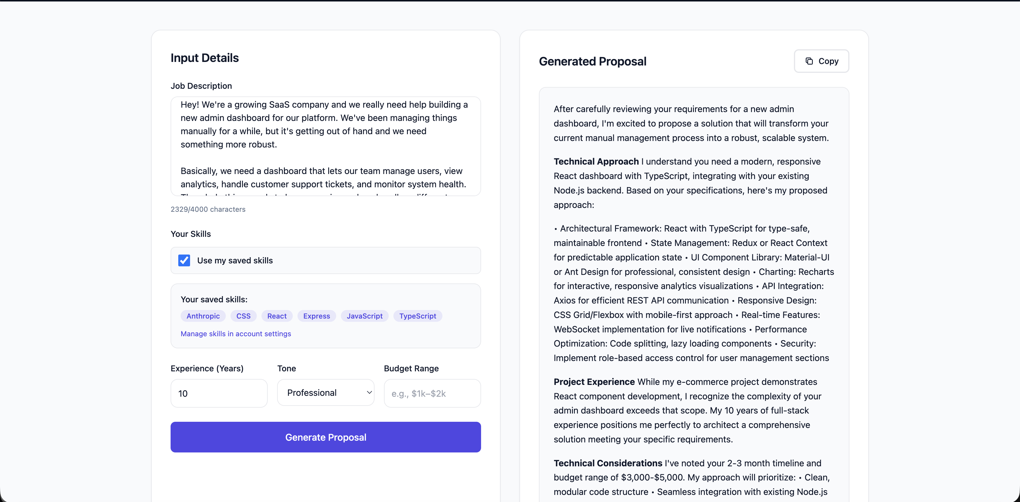 Notice how the proposal automatically references the "XYZ e-commerce project" in the "Relevant Experience" section, connecting it to the job requirements. This demonstrates real experience without manual research or memory.